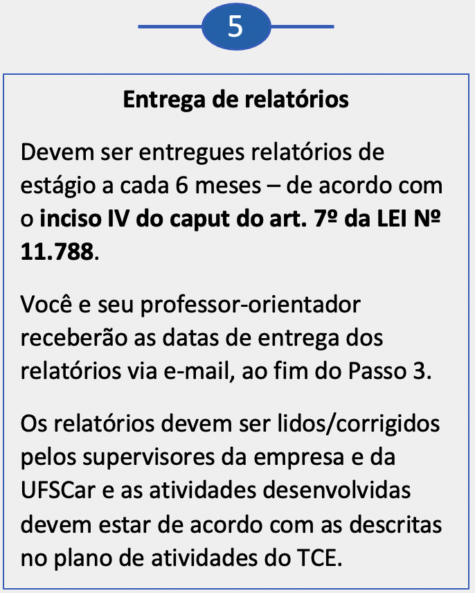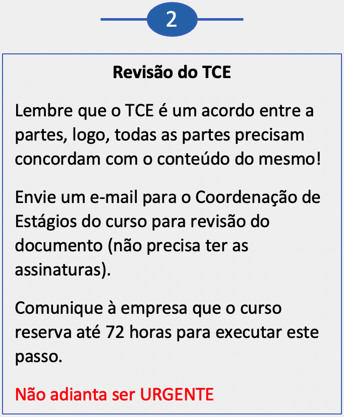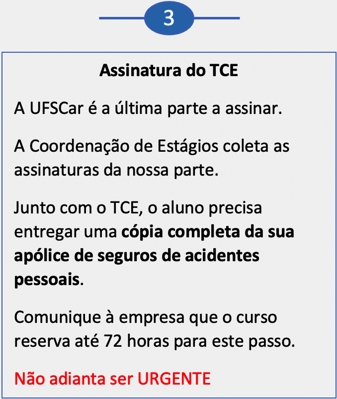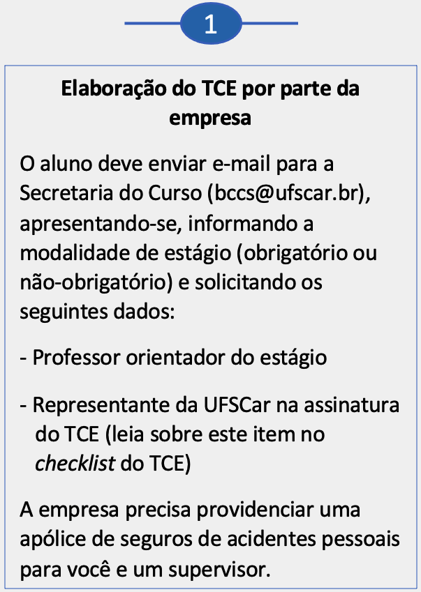 ![]() | Os modelos de TCE da UFSCar estão disponíveis aqui! Porém, a empresa pode escolher fazer o TCE através de uma agência integradora. – Durante o estágio, o(a) estudante será orientado(a) por um docente, atribuído no início do seu primeiro estágio. Normalmente, o docente-orientador supervisiona todos os estágios do(a) estudante durante o curso. – Para estágio obrigatório, leia também aqui! – Seja proativo e verifique o check-list do TCE antes da entrega! |